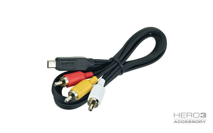 Connect your HERO3 camera to your TV with this composite cable (Mini USB to RCA) for standard definition preview + playback of your GoPro videos and photos. For HERO3 cameras only.