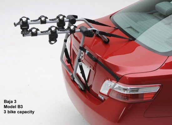 Baja deluxe trunk racks features easy to use quick- release adjustment hubs for a perfect fit on most vehicles. Six straps solidly attach the Baja to the rear of the vehicle, and soft rubber bike cradles with patented anti-sway blocks keep the bikes separated and rigid. Available in two and three bike capacities.