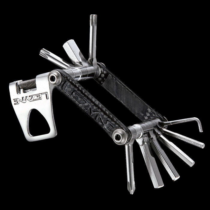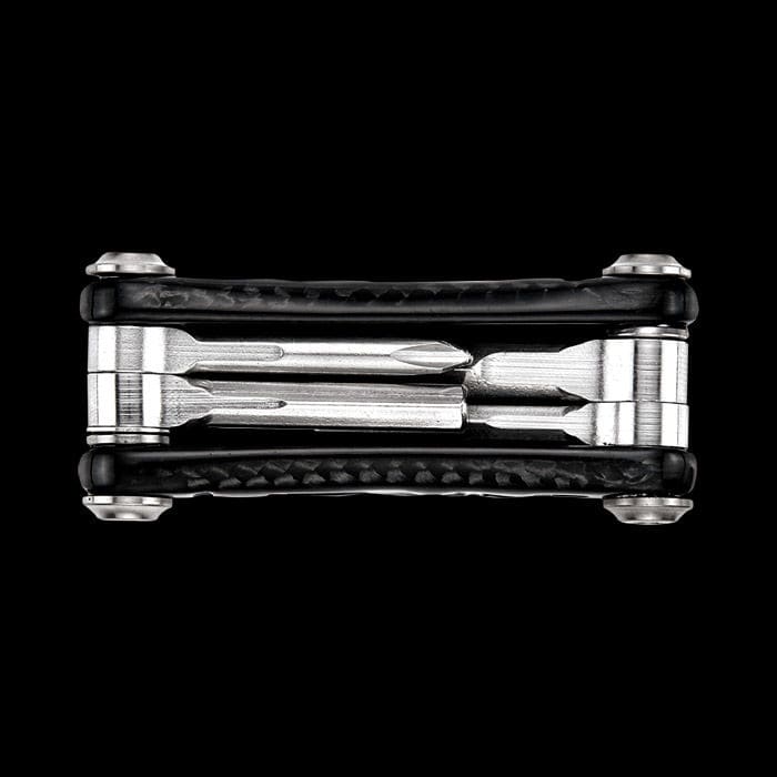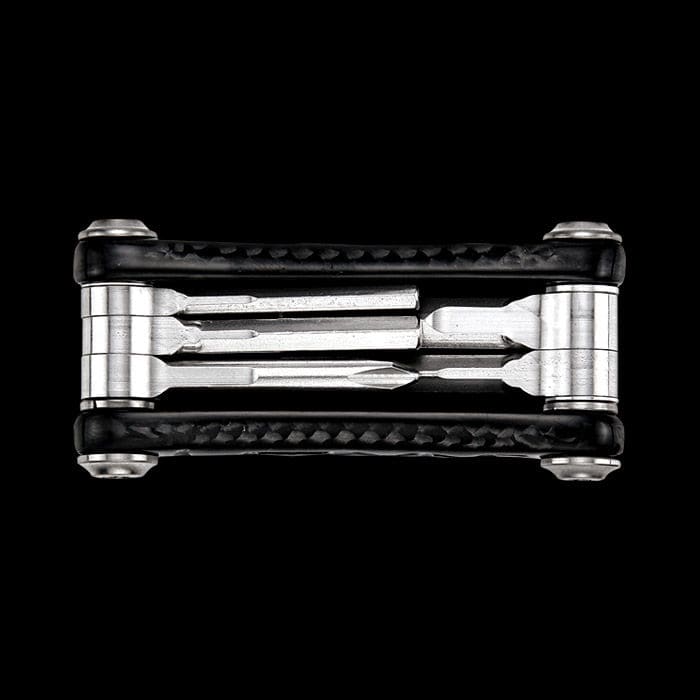 Carbon Tools use carbon, aluminum, and titanium to make the ultimate multi-tools. FCT side plates and custom machined titanium hardware keep the weight down without sacrificing tool rigidity or performance. Heavily machined and forged Center-Pivot stainless steel bits are lightweight and durable. Reduced-weight forged and CNC-machined aluminum chain breaker for 9/10 speed chains (Carbon 10 only).