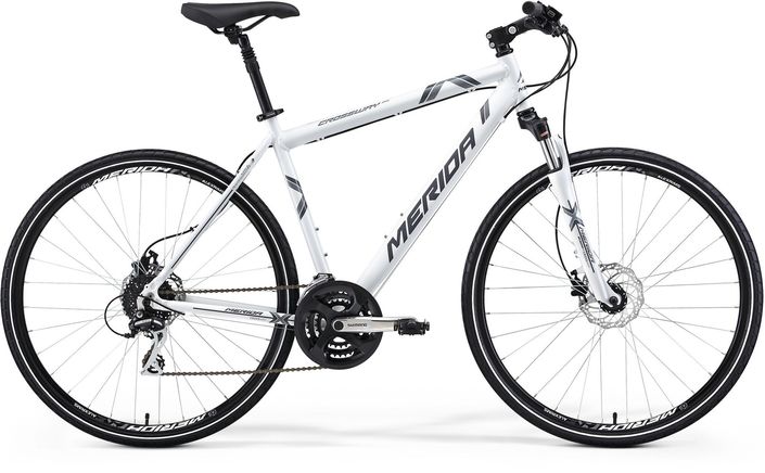 Merida's Crossway 20-D Men offers the best of both worlds: speed on paved surfaces, and surefooted handling on dirt paths. This bike features a rugged, lightweight aluminium frame and a plush Suntour fork. Reliable Shimano components make up the drivetrain, and parts from KMC and Merida finish things off. Hydraulic discs from Promax add confident braking to this versatile machine.